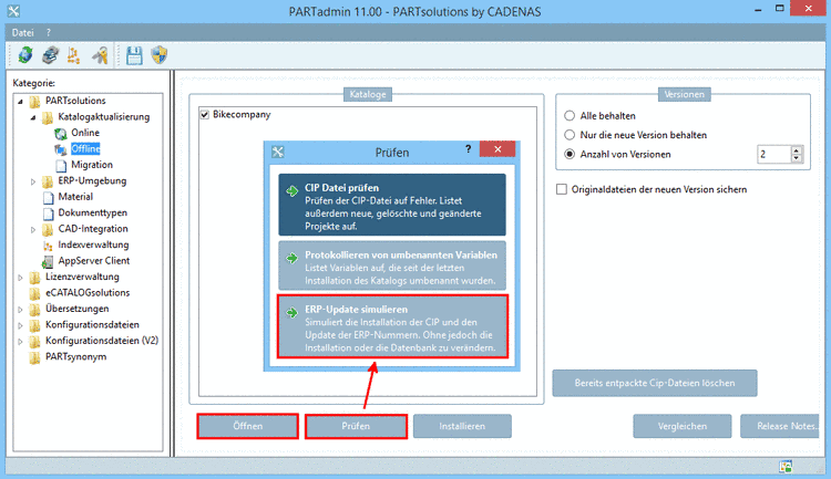 Im Dialogfenster Prüfen klicken Sie auf ERP-Update simulieren.