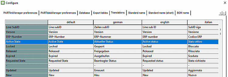 Dies korrespondiert mit der Auflistung in der Benutzeroberfläche unter PARTlinkManager -> Extras Menü -> Konfigurieren [Configure] Dialogfenster -> PARTlinkManager Einstellungen [PARTlinkManager preferences] Registerseite -> Spaltenanzeige konfigurieren [Modify column display].