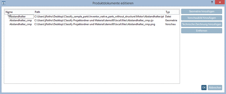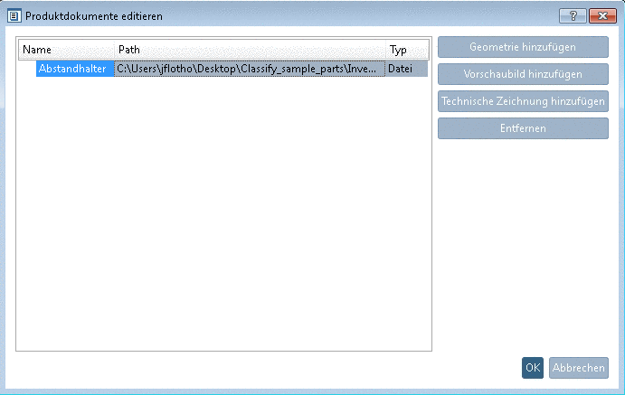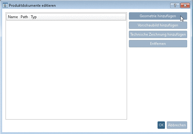 Auf der Dialogseite Produktdokumente editieren können Sie Geometrien, Vorschaubildern und technischen Zeichnungen zufügen.