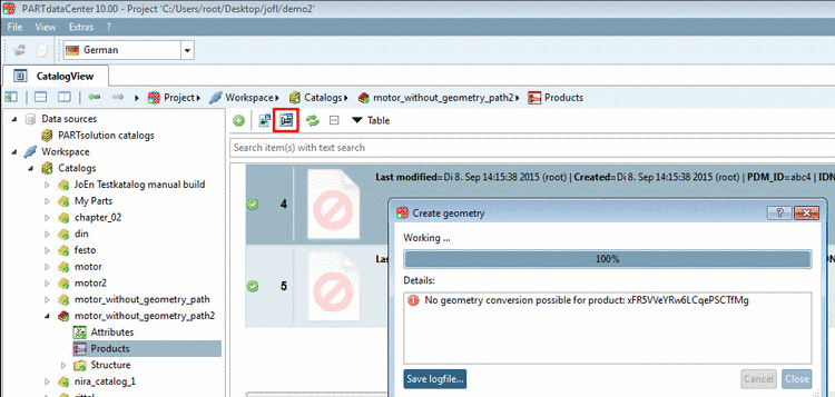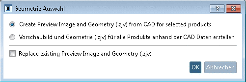 von CAD Datei erzeugen.Wählen Sie die entsprechend Option (hier im Beispiel soll nur für das selektierte Produkt das Vorschaubild und die Geometrie (.zjv) erzeugt werden) und bestätigen Sie mit Klick auf .