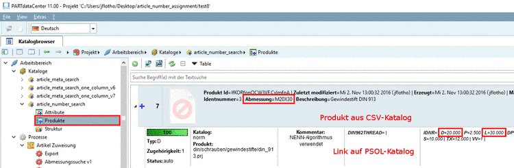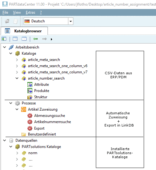Die folgende Abbildung zeigt, wie sich die Artikelzuordnung zwischen CSV-Daten und PARTsolutions-Daten in der Benutzeroberfläche von PARTdataCenter abbildet.
