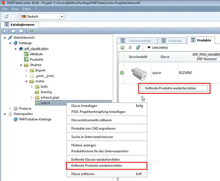 3. Um das entfernte Produkt wiederherzustellen, rufen Sie nun irgendwo im Dialogbereich Produkte oder auf der entsprechenden Klasse im Baum den Kontexmenübefehl Entfernte Produkte wiederherstellen auf.