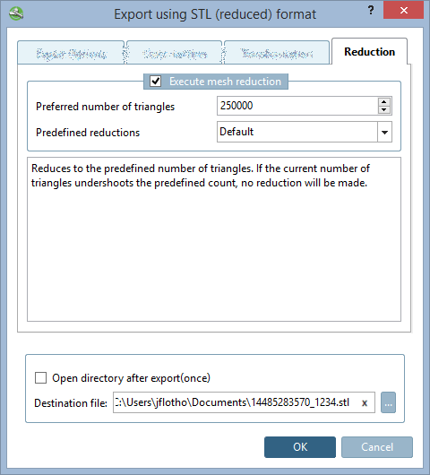 • Standard: Es wird auf die eingestellte Anzahl an Dreiecken reduziert. Ist diese Anzahl bereits unterschritten, so wird keine Reduktion vorgenommen. [Reduces to the predefined number of triangles. If the current number of triangles undershoots the predefined count, no reduction will be made.]