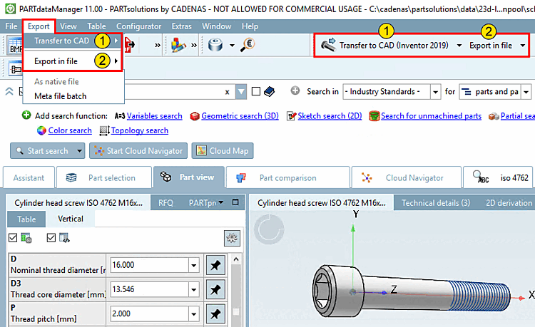 [60] Die Schaltfläche "An CAD übertragen [Transfer to CAD]" bleibt aktiv, unabhängig davon, ob sie im Weiteren aus dem 3Dfindit Menü aufgerufen wird oder Sie direkt in den PARTdataManager wechseln.