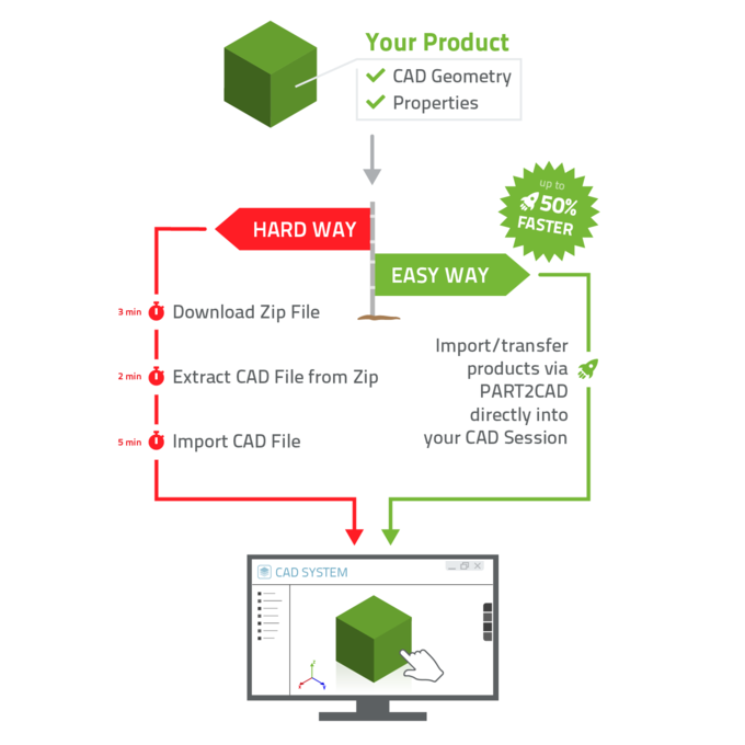 Ohne PART2CAD müssen Ihre Kunden die CAD Daten Ihres Elektronischen Produktkatalogs erst als ZIP Datei herunterladen, anschließend entpacken und danach manuell ins CAD System importieren. Mit PART2CAD als Add-On für Ihren eCATALOG lässt sich das benötigte CAD Modell direkt aus Ihrem digitalen Katalog heraus im CAD System öffnen. Die Wahl Ihrer Komponenten wird damit für Ingenieure und Konstrukteure zu einer echten Zeitersparnis während der Produktentwicklungsphase.