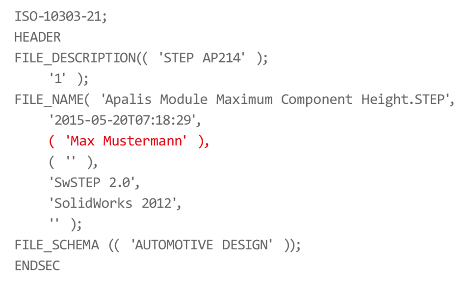 Your employee prepares the digital design data for your customers and exports into STEP format. The CAD software automatically adds metadata, such as author names, to the STEP file. As a rule it will be the real name of the respective employee.