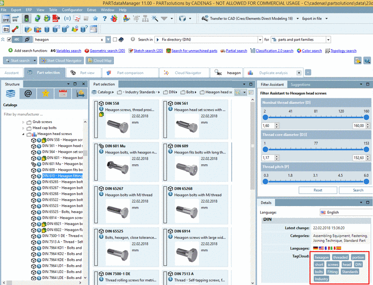 When executing a Full-text search topological measures of length are searched through as well, what is very advantageously, especially when using own part catalogs, because here, often a detailed characteristic attribute table is missing.
