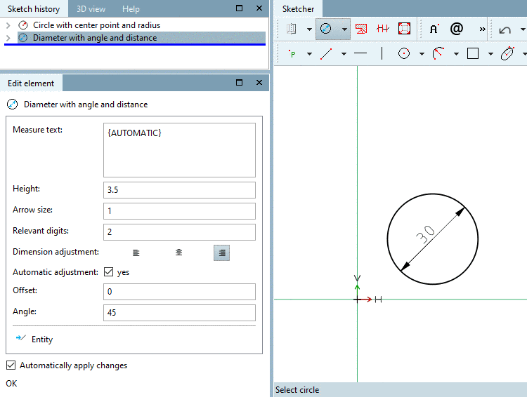 Select circle: Click on the circle to be dimensioned. -> The dimensioning line appears.