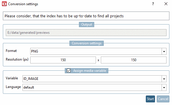The function Convert previews... converts all *.PRA (technical previews) of a project into the selected output format. Output is in a separate directory, namely in the same structure as in the catalog.