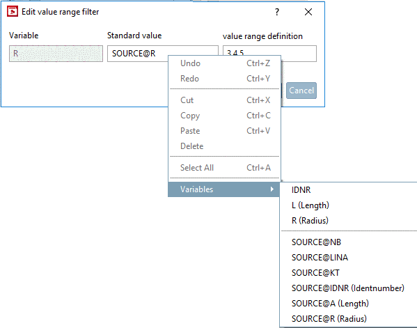 If a value range variable is selected as variable, the dialog box Edit value range filter is opened. Here, you can select a Standard value and if needed, change the value range definition.