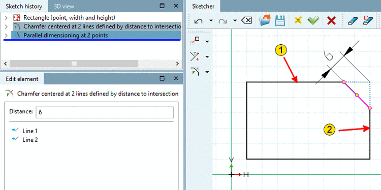 Chamfer between 2 lines, adjustable via Angle on the first selected line or a