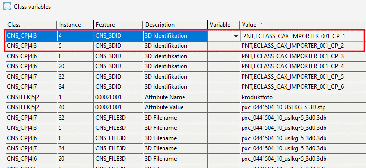 The attributes of the class CNS_CP|4|3 (Electrical Connection) are listed in the dialog box Class variables.