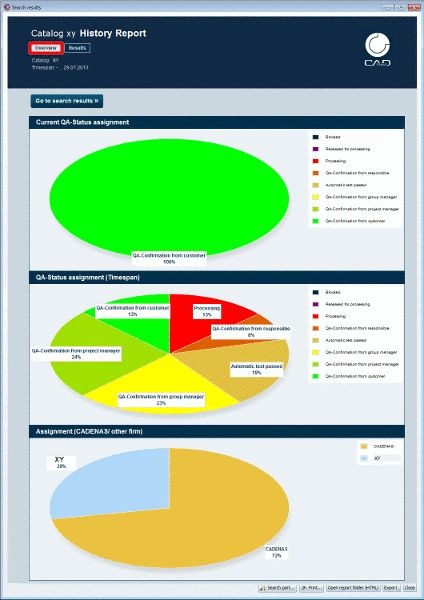The report opens in the Overview category and shows the sections Current QA-Status assignment, QA-Status assignment (timeframe) and Assignment (CADENAS/ other firm).
