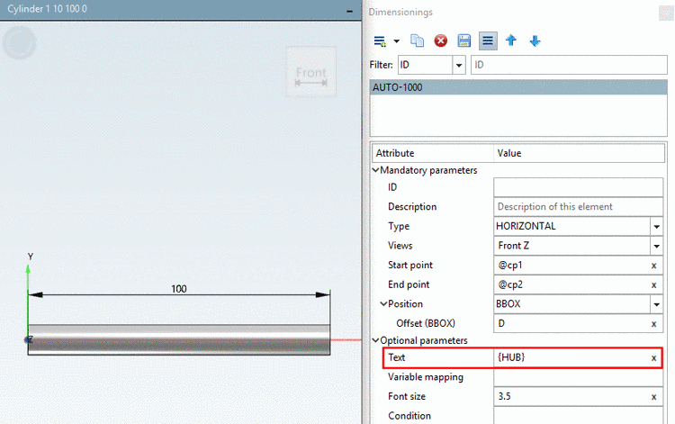 Optionally, you may set the automatic dimensioning. The displayed measure should not change when turning on the shortened view! Therefore, no IF condition is used for Text, neither {AUTOMATIC}, but '{HUB}'.