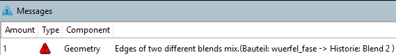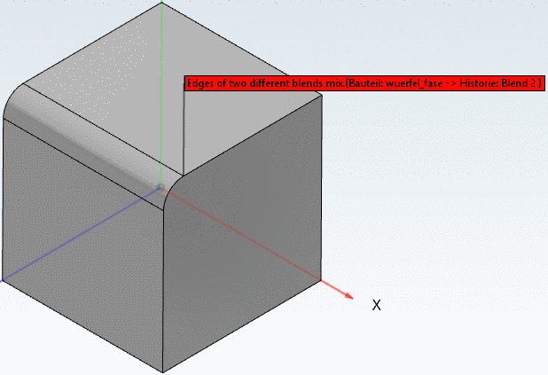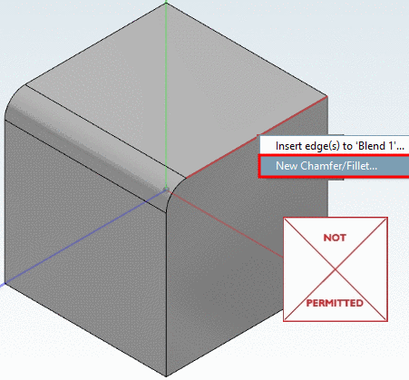 All blends, whose edges meet, have to be made as one blend. So the command New Chamfer/Fillet... can only be used initially. For further Blends the command Insert edge(s) to 'Blend xy' ... has to be used, otherwise an error message is displayed - even if the Blends have the same sizes (see following figures).