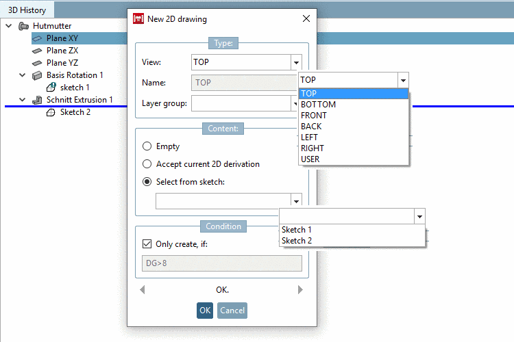 Accept current 2D derivation option: The current setting from the opened 2D derivation is transferred into the Sketcher (new 2-D sketch...). A perspective must already be selected in the 2-D view!