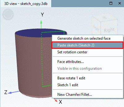 Via Copy (only sketch) you can copy a sketch and specifically insert it into the 3D view on one of the planes of an extrusion body or rotational body.