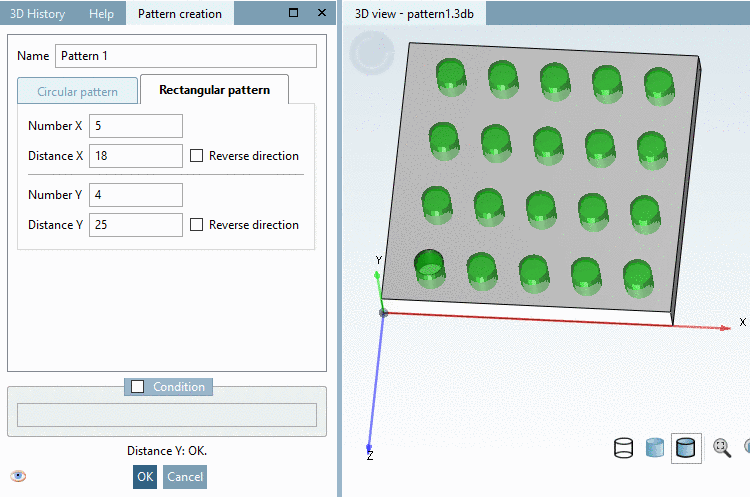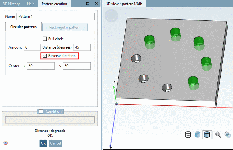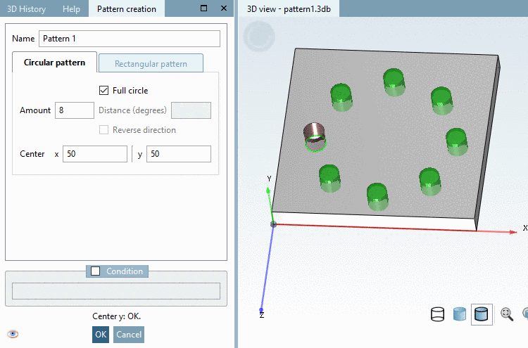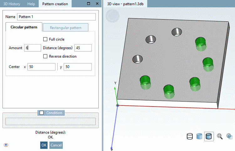 The pattern wizard allows to easily create, edit and delete a Circular Pattern or Rectangular pattern. Also it is compatible to older versions since no new features are used.
