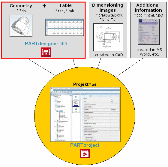 Geometries (*.3db files) and characteristic attribute table (*.tab/tac files), in addition with dimensioning images and other information make the so-called Project Files (*.prj files).