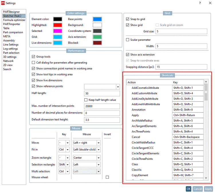 Under PARTdesigner -> Extras menu -> Settings... -> Sketcher (feat.) -> Shortcuts you can adjust already existing shortcuts.
