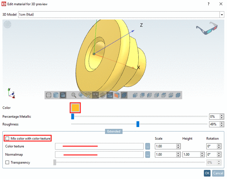 In the dialog box Edit material for 3D preview, you can perform the following settings: