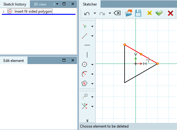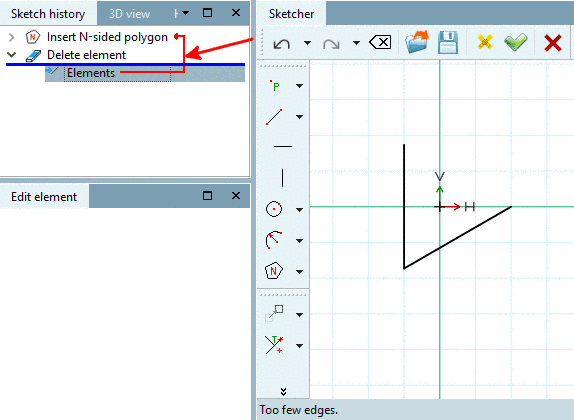 -> The element is removed in the Sketcher, however, in the Sketch history the corresponding Feature will be kept. A relation line from Feature Delete element to Feature of deleted element (see following figure) is created. This relation line is only visible if the subordinated feature is displayed.