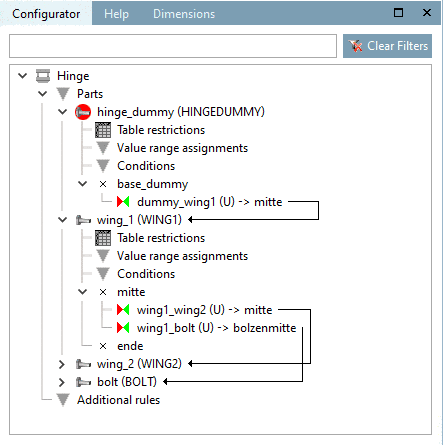 -> The relation between "base_dummy" and connection point "wing1" is signalized by a red arrow line.