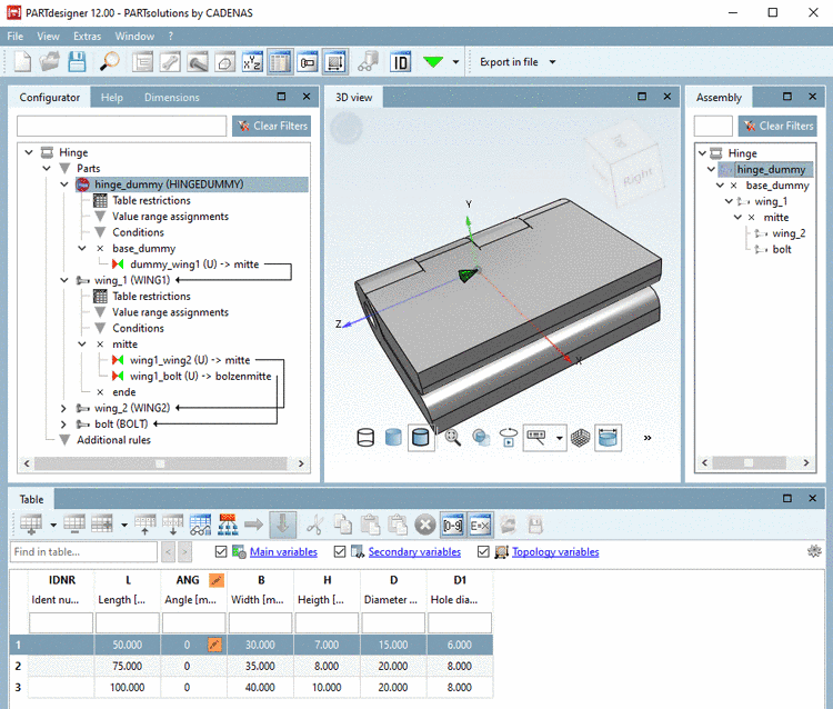 In the docking window Assembly, now build up the configuration by alternating selecting parts in the listing and selecting table rows.
