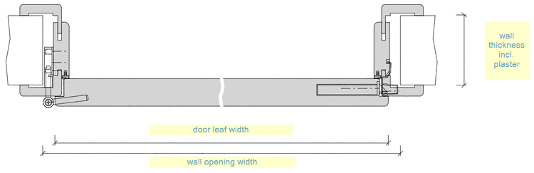 Wall opening width and height (must be wider and higher than the door leaf width/height because of mounting spaces) Common values for added spacing are: +35mm width and +17.5mm height. These values must be worked out and finalized with the manufacturer in the project workshop.