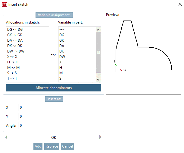 Variable assignment: You can allocate the variables in the sketch to be imported and the currently opened PARTdesigner sketch. In the Allocations in sketch field, you can see the variables of the imported sketch and in the Variable in part field, those of the current PARTdesigner sketch.