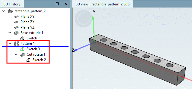 Final result: The boring pattern has been inserted. In the 3D History, you can see the design step Pattern.