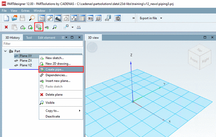 In PARTdesigner under 3D History -> any Plane, you can start the Pipe editing dialog via context menu command Create pipe.... The command Create pipe... is also available in the Tool toolbar.