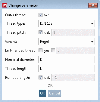 If you want to create a fine thread with a defined thread pitch, deactivate the checkbox and enter the variable name for the thread pitch (e.g. 'P').