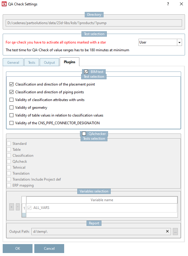 -> The QA Check Settings dialog box opens with the General, Tests, Output and Plugins tab pages.