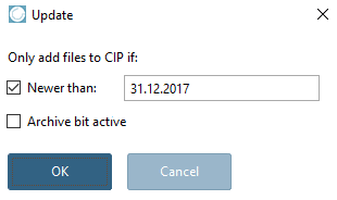When clicking on the browse button ... the Update (see fig.) dialog box opens. Here you can set a date filter so that only files Newer than are gathered. Concerning the Archive bit active option, please contact CADENAS Support.