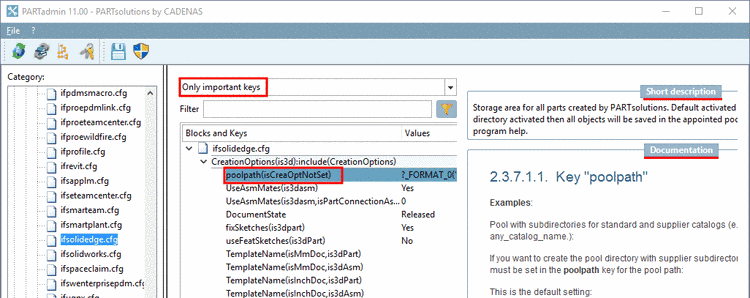 When selecting files, blocks or keys the adequate section from program help is displayed in the dialog area Documentation, in addition to Short description, if it's about more complex issues. For example, for settings of CAD interfaces, ERP settings or Tweak settings this is very helpful.