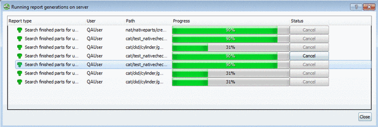 As soon as a report generation has been started, the dialog box Running report generations on server opens.
