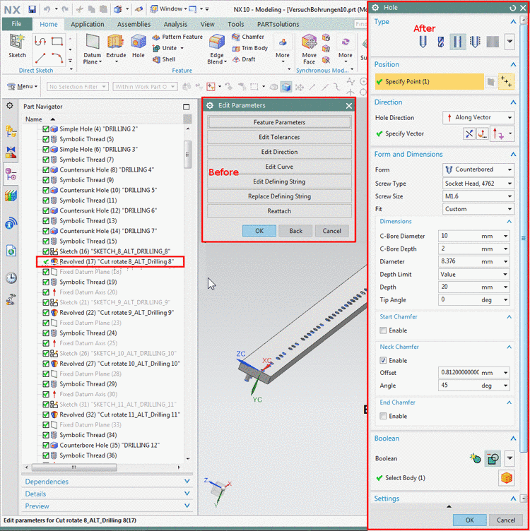The Hole features now support more native forms, such as end-counterbores (end chamfer) or both a countersink and a counterbore (neck chamfer).