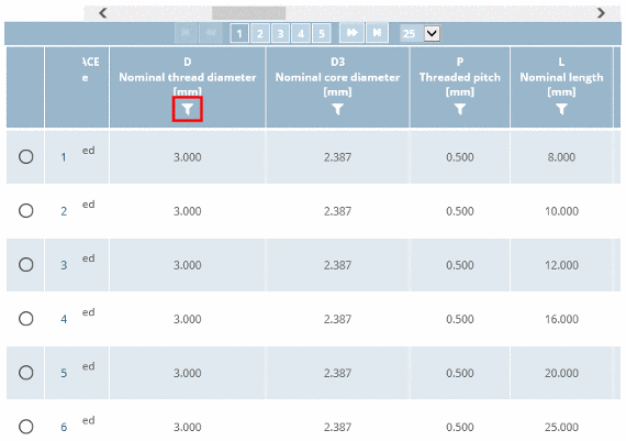 Use the filter especially for parts with many rows (characteristics), in order to minimize the number of displayed rows.