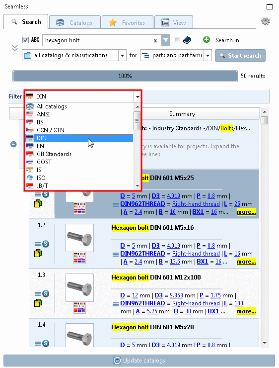 A catalog filter [Catalog filter] is displayed after a full text search [Full-text search] or variable search [Variables search]. If hits are obtained across several catalogs, you can subsequently restrict the results to a specific catalog.