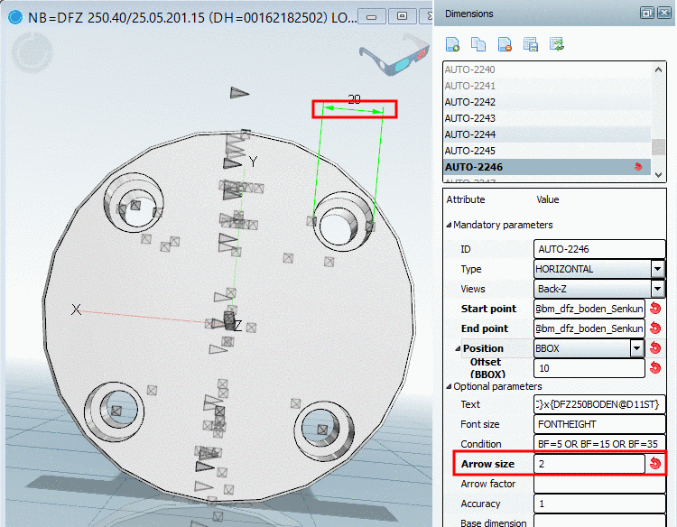 In the upper dialog area the IDs of all dimensionings of the loaded part are listed (AUTO-1000, AUTO-1001, AUTO-1002 etc.).
