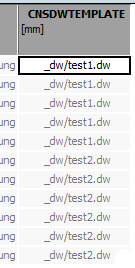 As soon as the CNSDWTEMPLATE column (the name is mandatory) exists in the table, the corresponding dw files are used. Enter the path to the desired dw file for each line, relative to the loaded project.