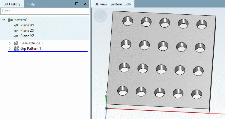 -> The rectangular pattern is displayed in the 3D History, under Grp Pattern.