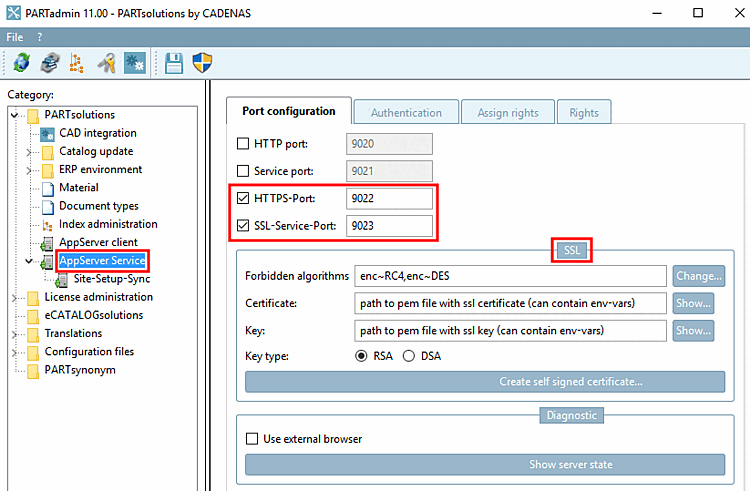 The setting options for authentication [Authentication], rights assignment [Assign rights] and rights [Rights] can be found in PARTadmin under AppServer Service. It is also important to use HTTPS / SSL for the port configuration [Port configuration] (see below).