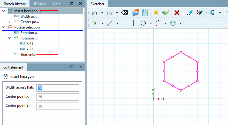Select the Insert hexagon item in the sketch history [Sketch history].