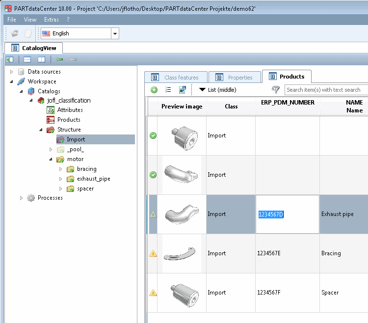 The import process now runs through and the imported components are displayed on the Products tab page. Each line is marked with a blue plus sign, which indicates that the products have not yet been uploaded to the server.