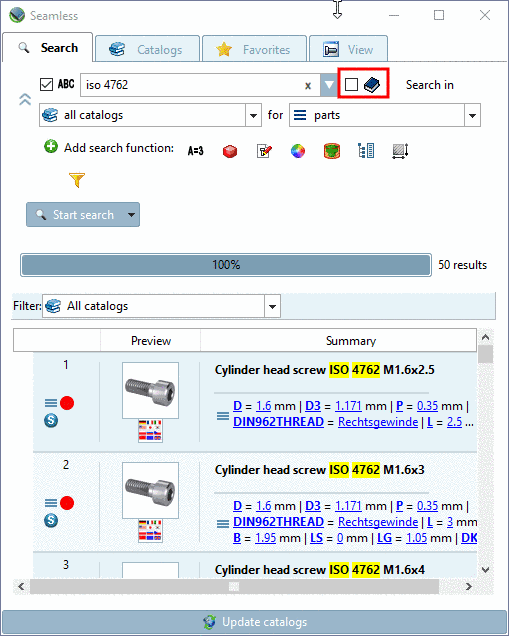 Detailed information on the Synonym search can be found under Section 3.1.6.4.3.5, “ Full-text search supplemented with synonyms ” in PARTsolutions - User manual.