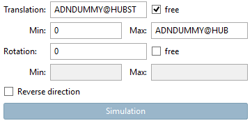In the Positioning dialog area, the Translation [Translation] " Free [free] " checkbox must be activated and the minimum [Min] and maximum values must be specified according to the physical limits of the "real" product. (In this example, we are dealing with a translation [Translation] movement of the piston rod)