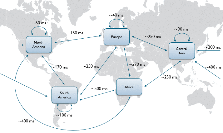 For example, latency within Europe is about 40 ms, between Europe and South America about 250 ms. See following figure.