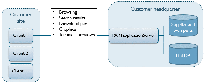 In a standard setup the supplier parts, own parts and link database is only accessed through the PARTapplicationServer. Actions like browsing and searching only need a small bandwidth. Viewing a part needs to download the data locally which needs more bandwidth depending on the part complexity.